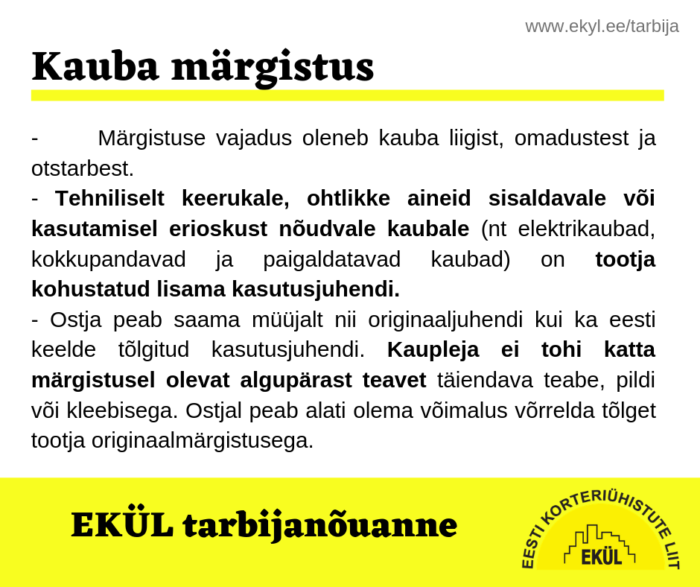 - Tehniliselt keerukale, ohtlikke aineid sisaldavale või kasutamisel erioskust nõudvale kaubale (nt elektrikaubad, arvutid, kodumasinad, kokkupandavad ja paigaldatavad kaubad) on tootja kohustatud lisama kasutusjuhendi.